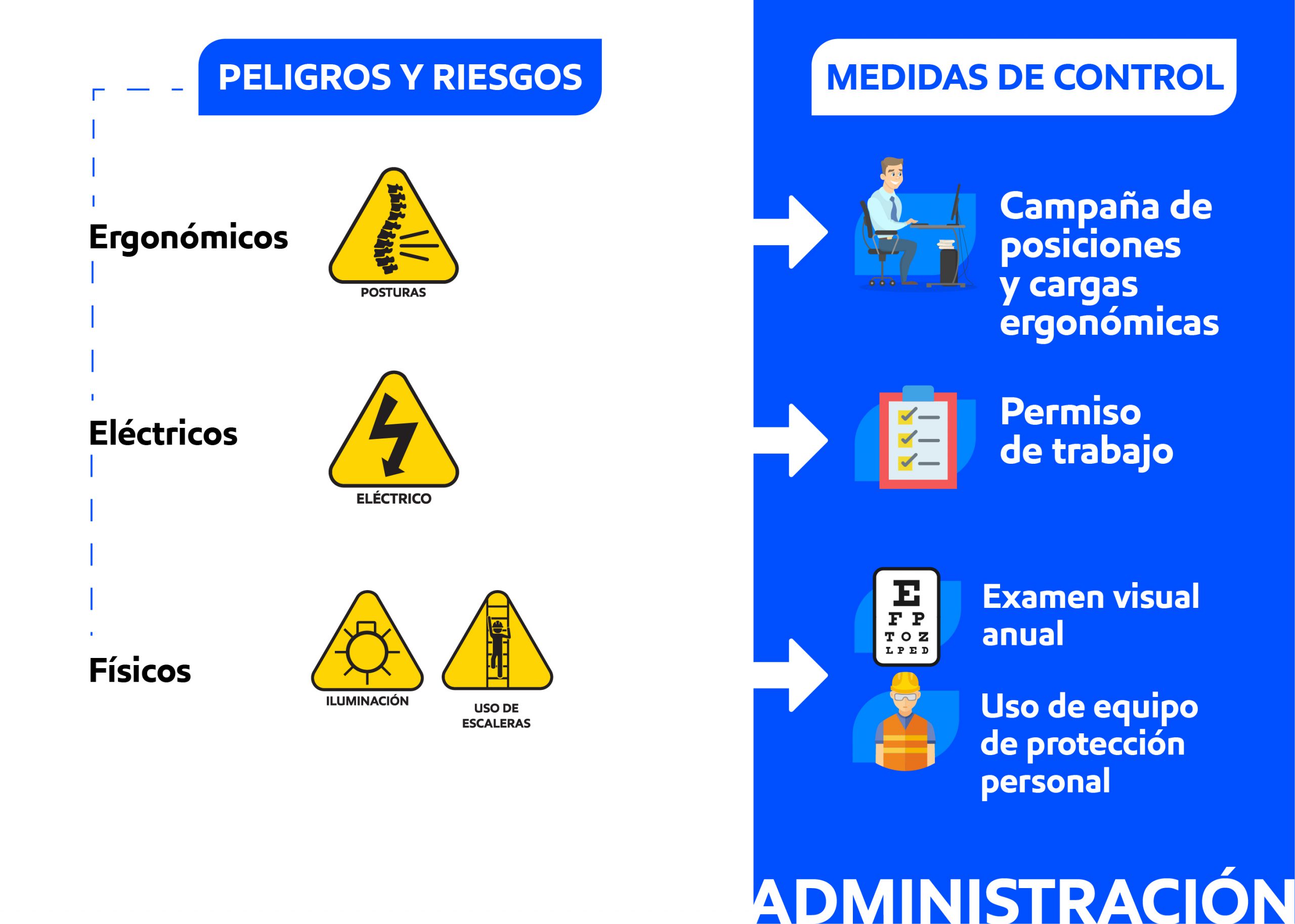 Eléctricos: La electricidad se utiliza en casi todos los entornos laborales y se tiende a olvidar que es muy peligrosa. Nunca manipules tableros eléctricos o utilices instalaciones que se aprecian en malas condiciones. Nuestro personal de mantenimiento se encargará de mitigar estos riesgos.